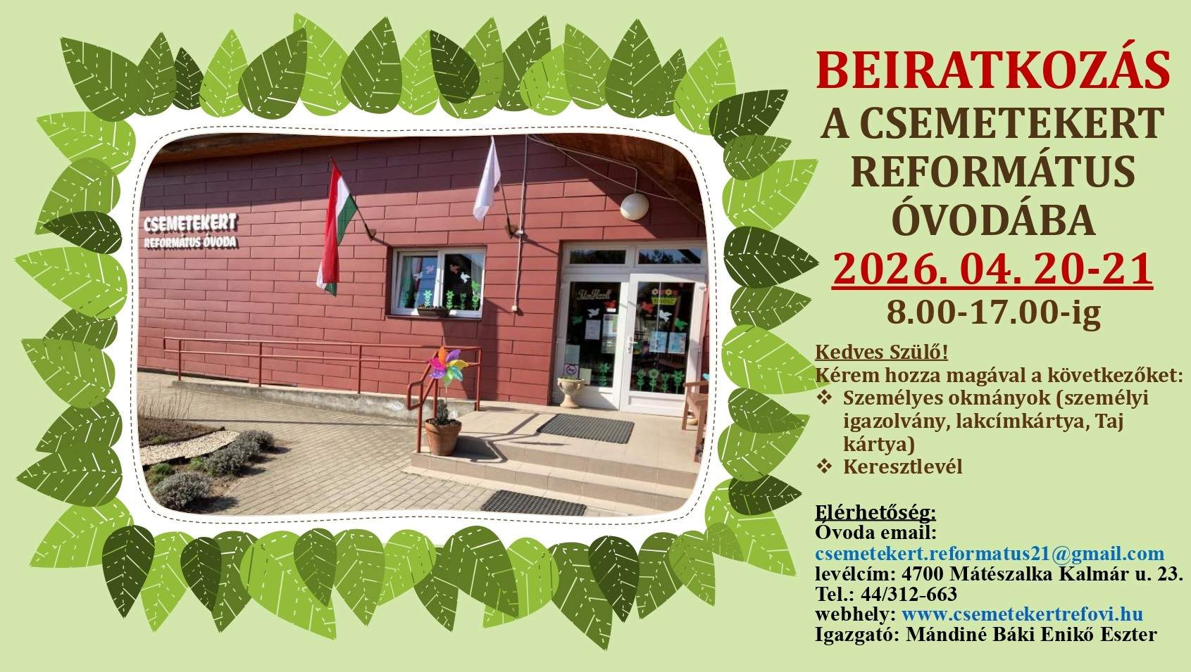A Mátészalka Kertvárosi Református Egyházközösség fenntartásában működő Csemetekert Református Óvoda vonatkozásában a 2026/2027. nevelési évre történő beiratkozás időpontját 2026. április 20-21. napjaiban határozta meg.